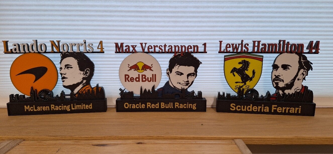 Laat jouw liefde voor Formule 1 zien met deze unieke 3D geprinte F1 coureur display. Het ontwerp combineert het gezicht van de coureur, het team waarvoor hij rijdt en een iconische skyline van het bijbehorende land. Een echte eyecatcher voor elke F1-liefhebber.